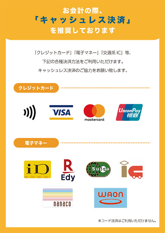 「クレジットカード」「電子マネー」の下記の各種決済方法をご利用いただけますので、ご協力をお願いいたします。