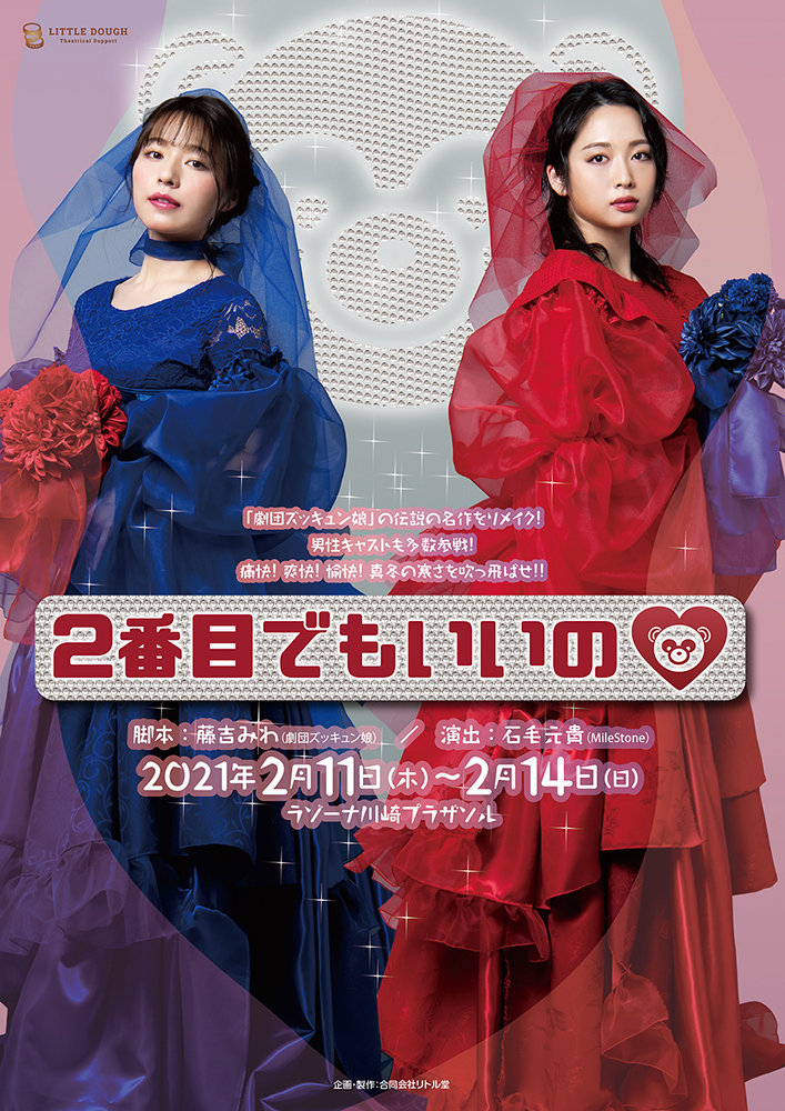 2021年2月11日~14日にラゾーナ川崎プラザソルでの公演を予定しておりました「2番目でもいいの♡」でございますが、新型コロナウィルスの感染拡大が続く現状を鑑みて、公演を中止する判断をいたしました。