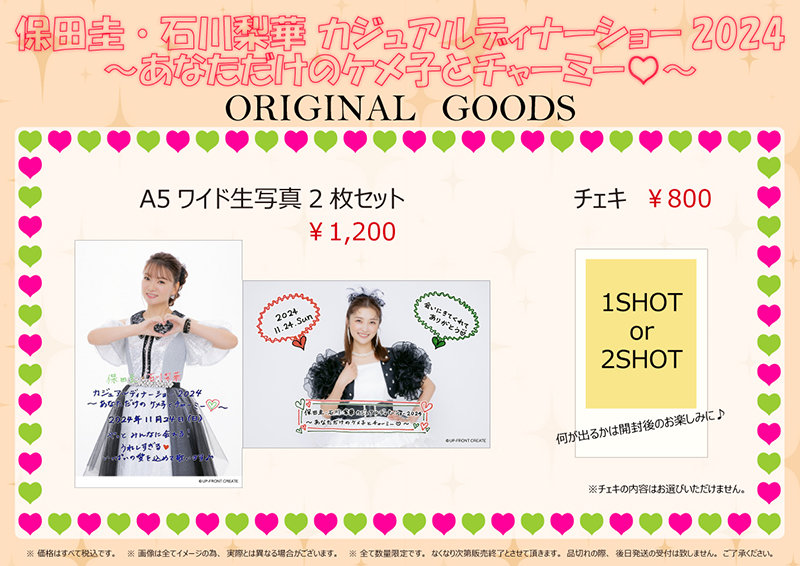 11/24「保田圭・石川梨華カジュアルディナーショー2024 ~あなただけのケメ子とチャーミー♡~」オリジナルグッズ公開・会場販売のお知らせ