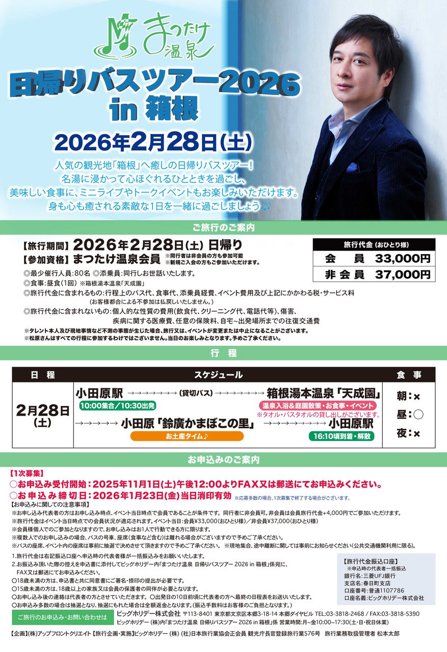 「まつたけ温泉 日帰りバスツアー2026in箱根」開催決定!