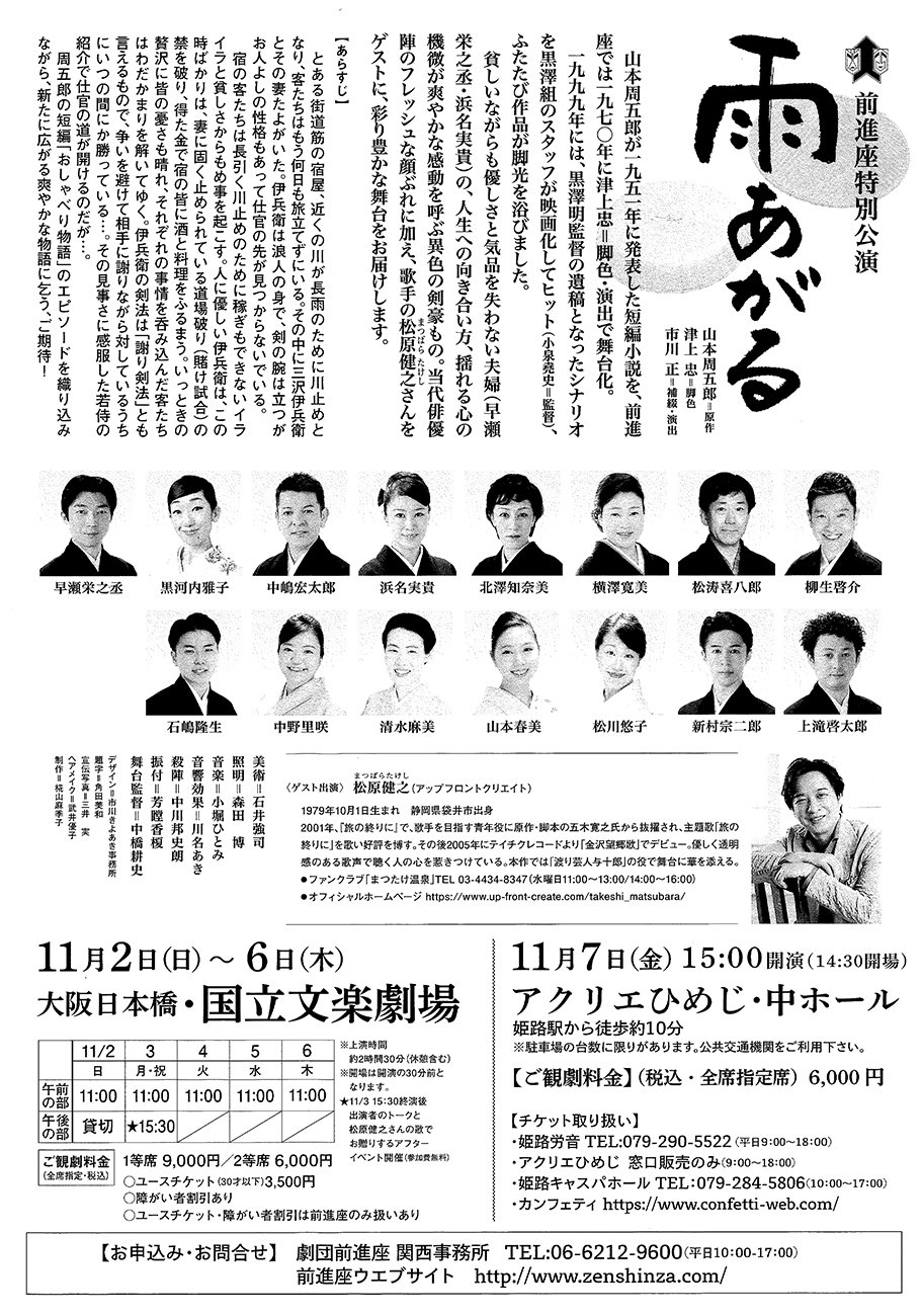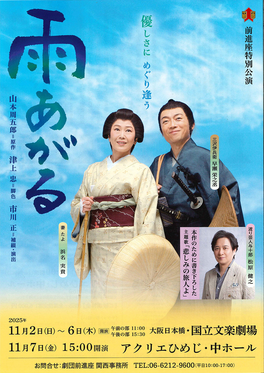 | 11/7(金) | アクリエひめじ(中ホール) (兵庫) | 14:30 | 15:00 | 全席指定席 6,000円 【お申し込み・お問い合わせ】 前進座 関西事務所:06-6212-9600 |