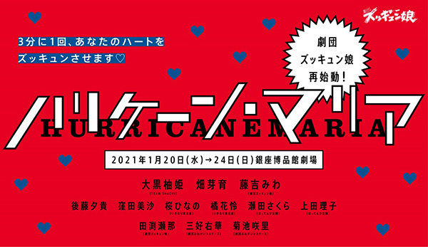 1/7(木)の政府からの緊急事態宣言を受けまして、今回の劇団ズッキュン娘第15回本公演『ハリケーン・マリア』につきましては感染予防対策を講じるため上演スケジュールを見直すことといたしました。