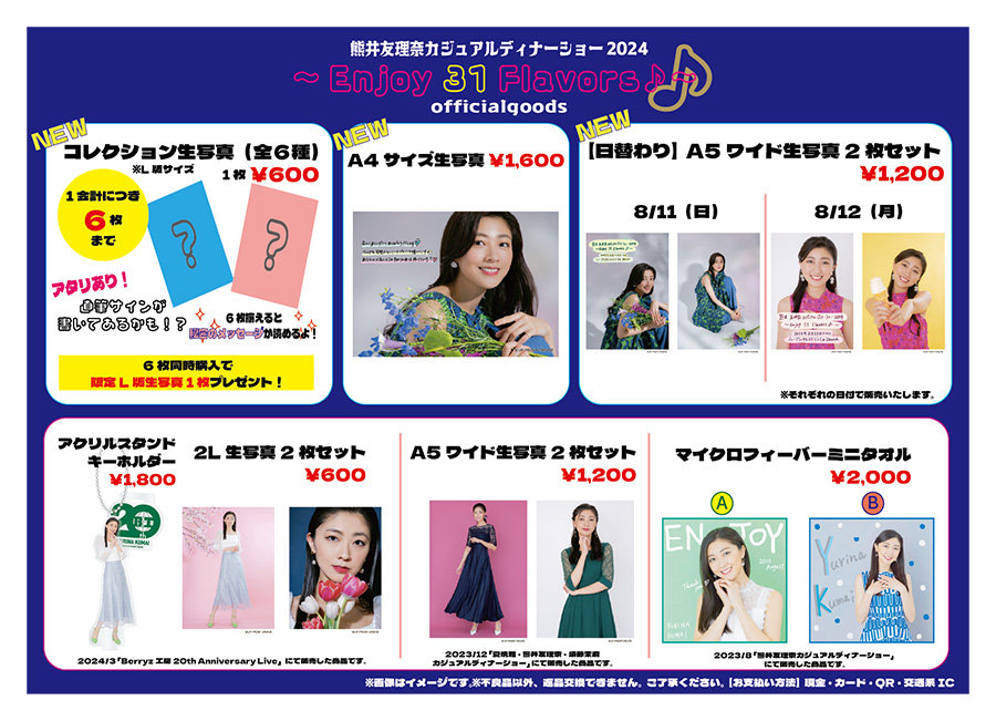 8/11・12「熊井友理奈カジュアルディナーショー2024~Enjoy 31 Flavors♪~」販売グッズと販売時間のお知らせ